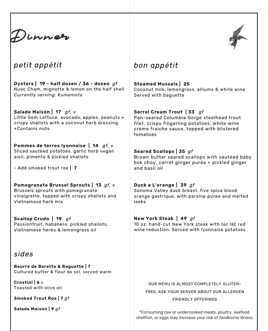 Classic French, with Vietnamese twists…Make your reservations here! (tues-sat evening)Dinner menu below, constantly evolving, please email us for most updated menu Gallery Block This is an example. To display your Instagram posts, double-click here to add an account or select an existing connected account. Learn more
